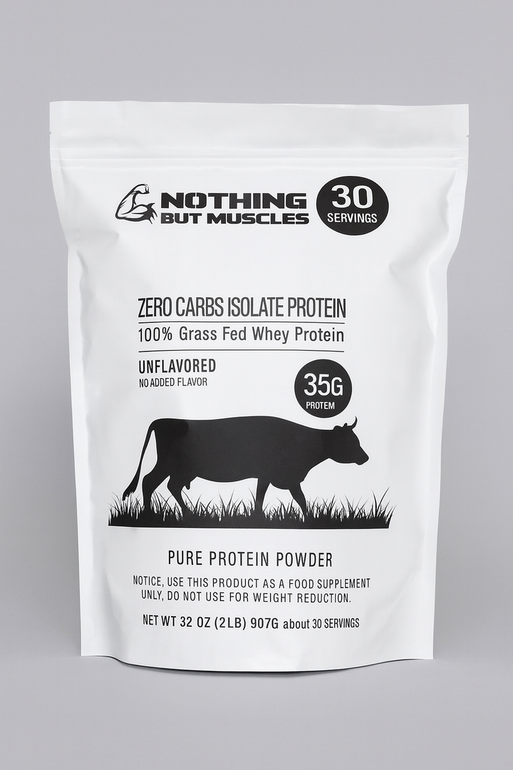 Fuel your body with clean, fast-absorbing protein designed for peak performance. Nothing But Muscles Zero Carbs Isolate Protein is made from 100% grass-fed whey, delivering ultra-pure, zero-carb nutrition to support lean muscle growth, strength, and recovery. With 35g of high-quality protein per serving, this unflavored isolate mixes effortlessly into shakes, smoothies, and recipes without altering taste.